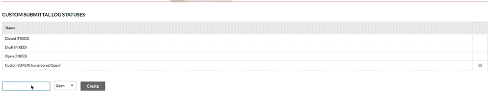 Créer un ou plusieurs statuts du registre des livrables personnalisés pour l'outil Livrables. Les statuts par défaut dans Procore sont « Ouvert », « Ébauche » et « Fermé ».