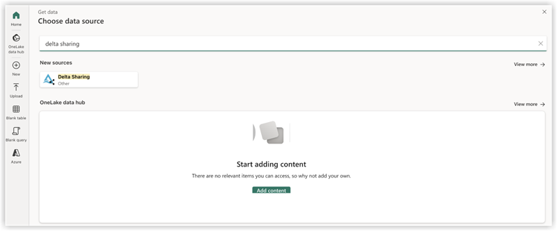 - Cliquez sur Obtenir des données, puis sur Plus et recherchez Partage Delta.