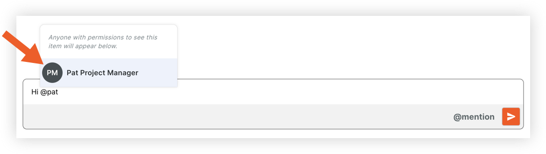 - Saisissez un message dans la zone de texte. Appuyez sur le symbole @ de votre clavier et commencez à saisir un nom, ou cliquez sur @mention pour afficher la liste des utilisateurs.