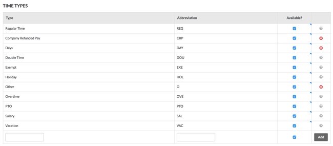 - Si vous souhaitez exclure certains types de paie, dans la colonne Disponible ?, décochez les cases à côté des types de paie que vous souhaitez masquer dans le menu déroulant « Types d'horaires » lorsque vous créez une entrée de carte de présence.