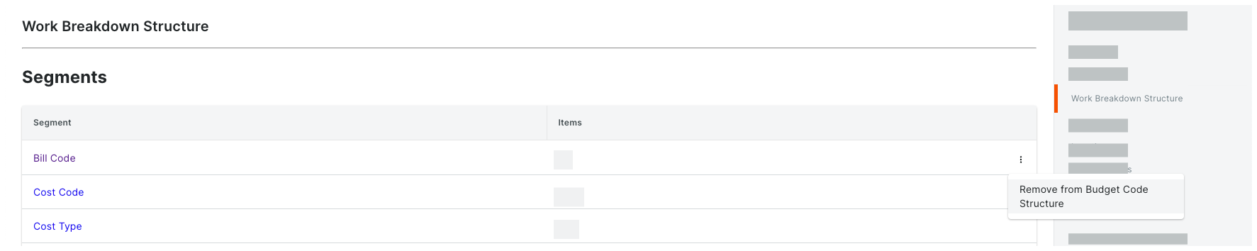 - Dans le tableau « Segments », cliquez avec le bouton droit sur les points de suspension verticaux et choisissez l'option de menu Supprimer de la structure des codes budgétaires.