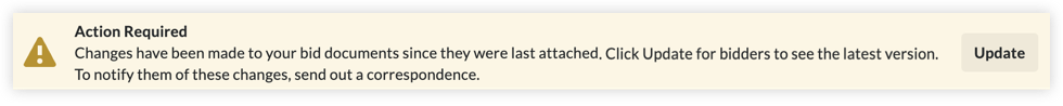 Si des mises à jour ont été apportées aux documents d'appel d'offres en dehors du dossier d'appel d'offres (par exemple, si des fichiers ont été chargés dans votre dossier d'appel d'offres dans l'outil Documents), vous verrez une bannière vous informant que des modifications ont été apportées aux fichiers.