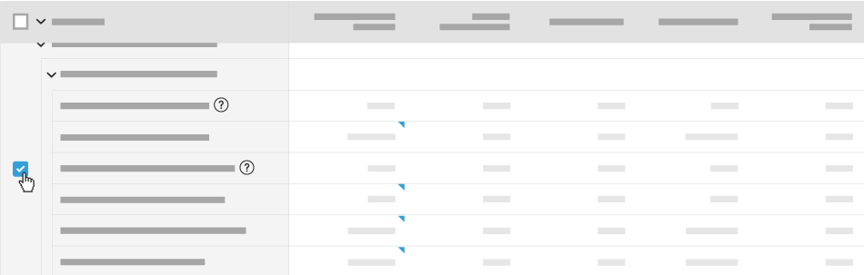 Remarque: Procore affiche un point d'interrogation (?) à côté des postes associés à des combinaisons code de coût, type de coût et sous-projet non budgétés. - Survolez la colonne de gauche jusqu’à ce qu’une case à cocher s’affiche. Cochez ensuite la case.
