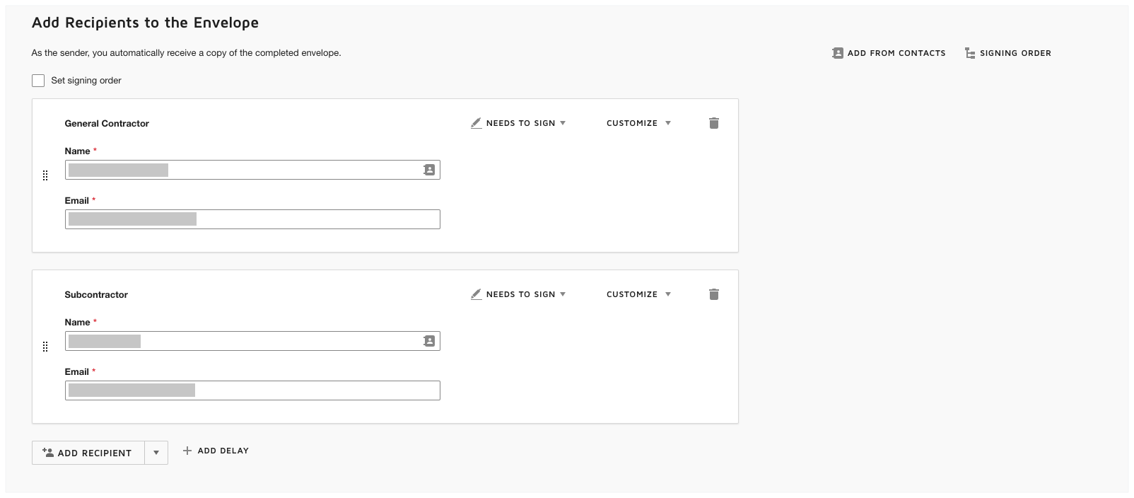 - Les cases de signature requises pour chaque « rôle » du contrat. Par exemple, l’entreprise générale ou le sous-traitant qui sont parties au contrat d’engagement. Cela inclut le Nom et l’Adresse e-mail de chaque utilisateur. Pour plus d’informations, voir Ajouter des destinataires à l’enveloppe ci-dessous.