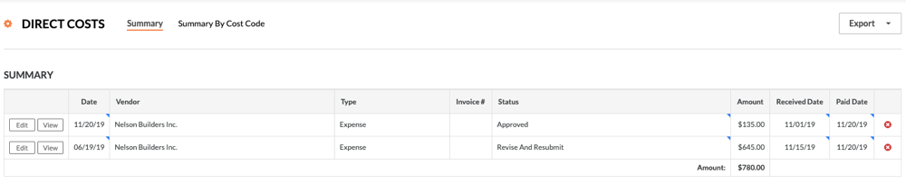 Cet onglet récapitule vos données sur les coûts directs dans un format tabulaire qui répertorie les postes par date, fournisseur, type, numéro de facture, statut, montant, date de réception et date de paiement des coûts directs de votre projet. Vous pouvez cliquer sur n'importe quel en-tête de colonne du tableau pour trier les postes par cet en-tête de colonne.