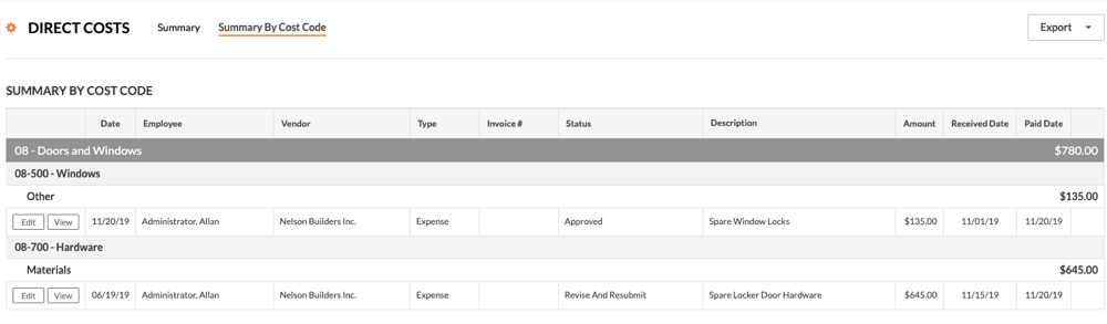 Cet onglet regroupe les codes de coûts de votre projet par division, puis récapitule vos postes de coûts directs sous forme de tableau. Les postes sont répertoriés par date, employé, fournisseur, type, numéro de facture, statut, description, montant, date de réception et date de paiement des coûts directs de votre projet.
