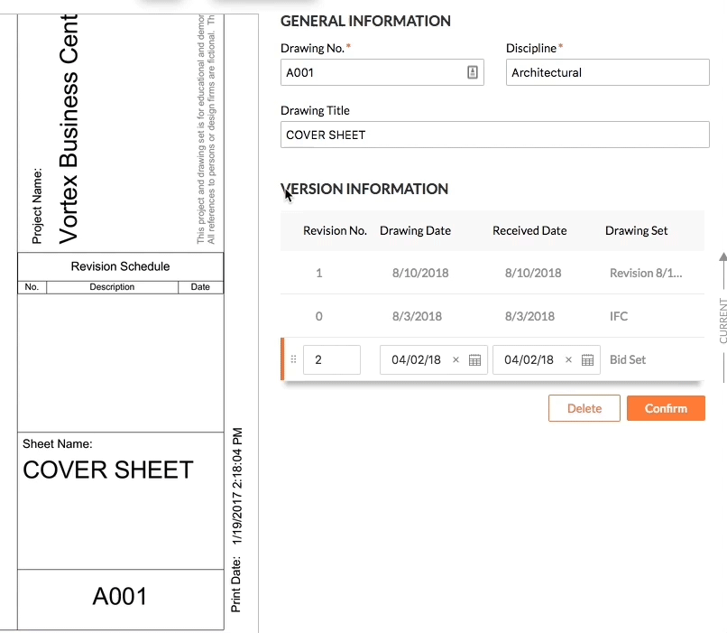 - Si vous avez entré une date de plan pour un lot de révisions de plan, Procore trie les plans du plus ancien au plus récent en fonction des dates de plans. Cependant, les numéros de révision peuvent devoir être entrés manuellement.