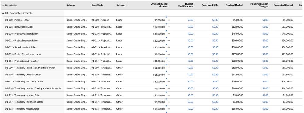 L’exemple ci-dessous vous montre les postes d’un budget qui peuvent être utilisés pour créer des postes correspondants sur la VDC du contrat. Par exemple, 01-000-Objectif: Main-d’œuvre, 01-002-Instructions : Main-d’œuvre, 01-010 Chef de projet : Main-d’œuvre, etc.