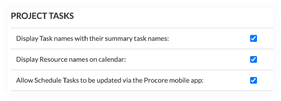 - Autoriser la mise à jour des tâches du planning via l'application mobile Procore: Cochez la case pour activer la mise à jour des tâches du planning à partir d'un appareil mobile à l'aide de l'application mobile Procore.